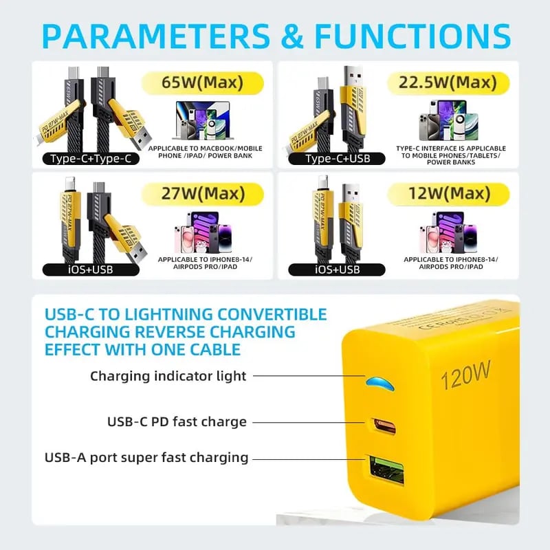 Fast Charging : Experience rapid charging with our 120W Charger&4-in-1 cable, supporting up to 27W for phones and 65W for iPads. It can power your device to 50% in just 30 minutes.