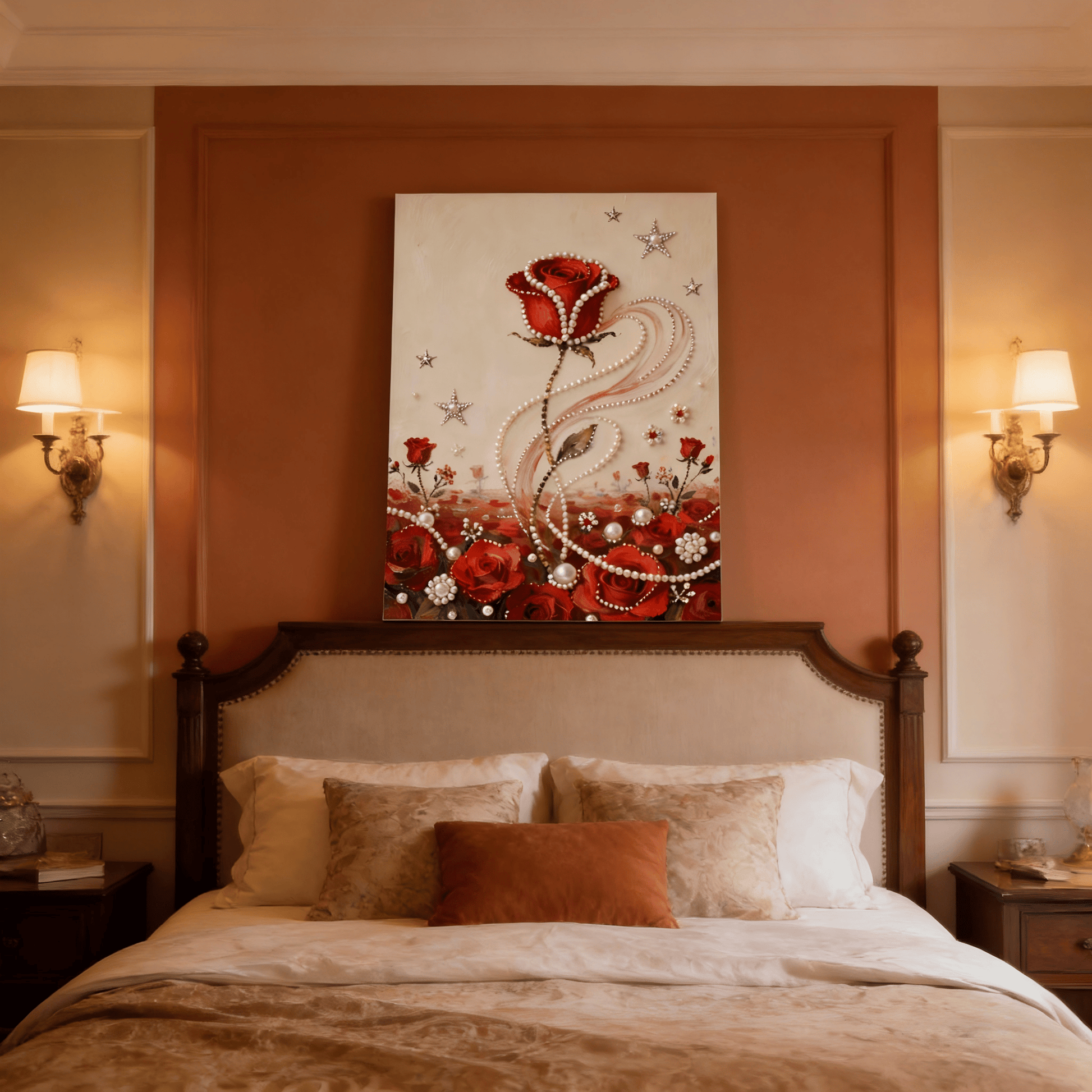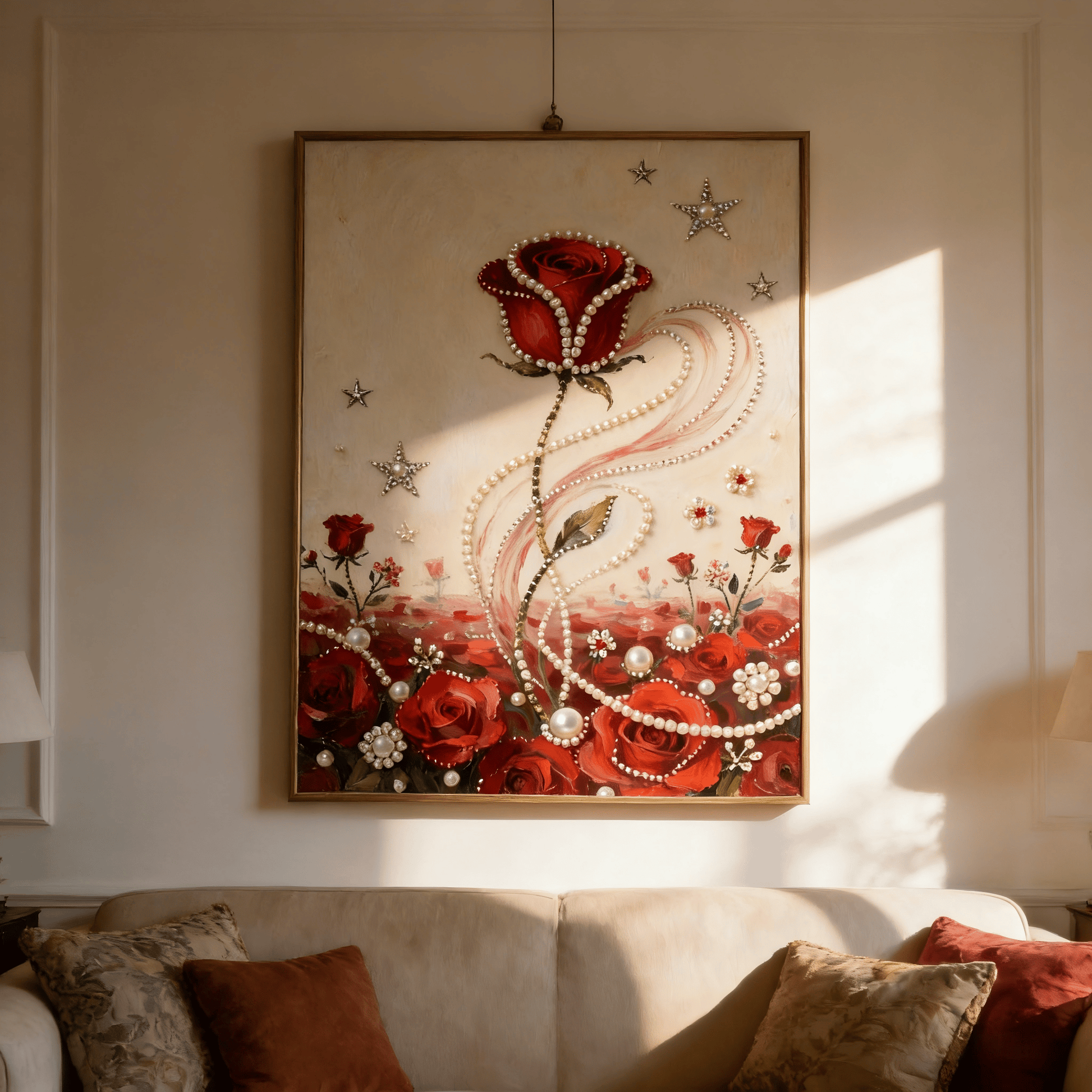 - Material: High-Density Canvas (Pre-printed with adhesive), Acrylic Resin Pearl Beads/Drills