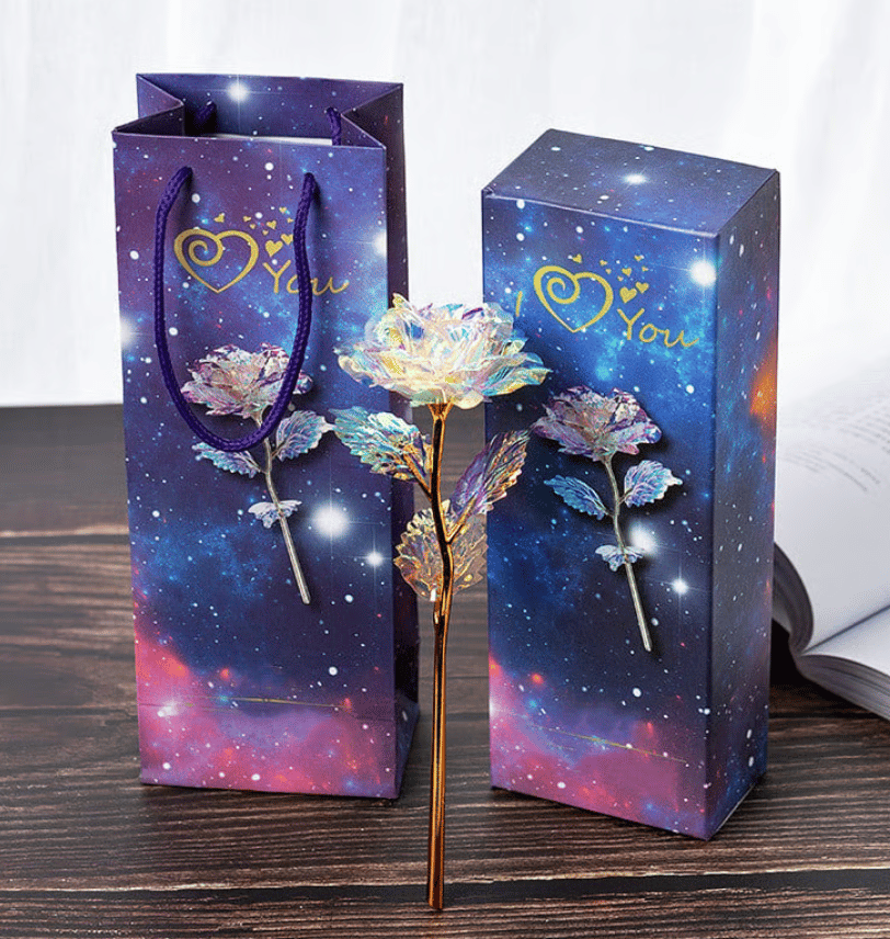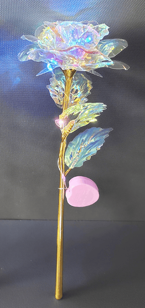 Finally, we cover them in an iridescent holographic coating to make the rose sparkle in the light.