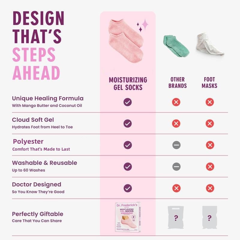 Unlike regular socks that absorb moisture from your skin,our socks feature a specialized gel lining (or intensivemoisturizing layer) that creates a protective barrier. Thisseals in your skin's natural oils and boosts the absorptionof your favorite foot creams sixfold.