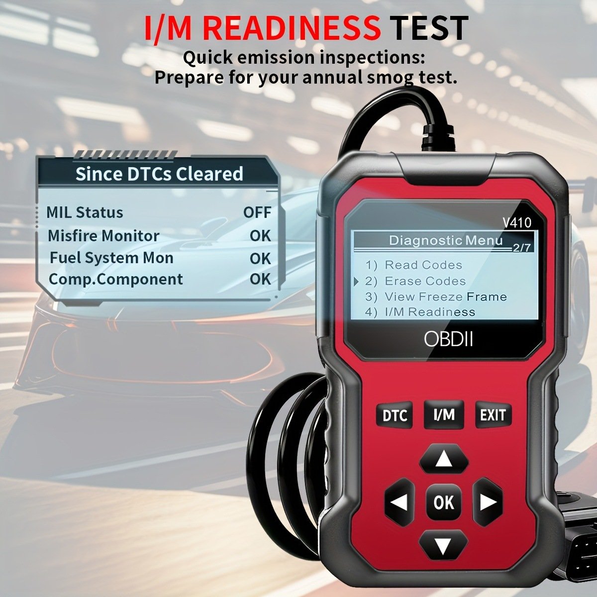 The V410 has a user-friendly interface with buttons for DTC, I/M, EXIT, OK, and navigation. It's designed for straightforward diagnostics.