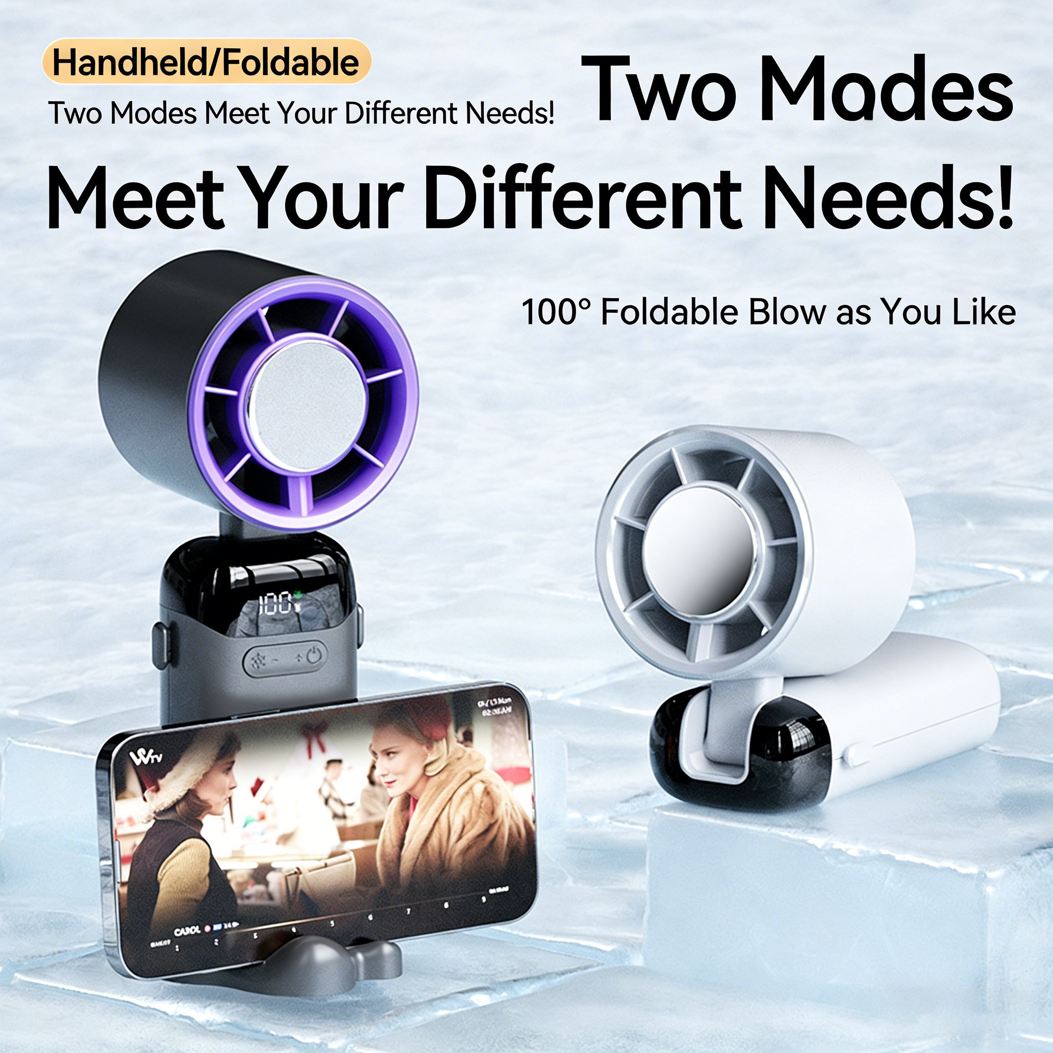 2026 Flagship PRO 5-in-1 USAGE MODE: Seamlessly switch between Handheld, Neck-hang, Desktop, Ice Compress, and Phone Stand modes.. The adjustable 135° folding design allows you to effortlessly switch between modes, whether you're commuting, working at a desk, or enjoying outdoor activities.